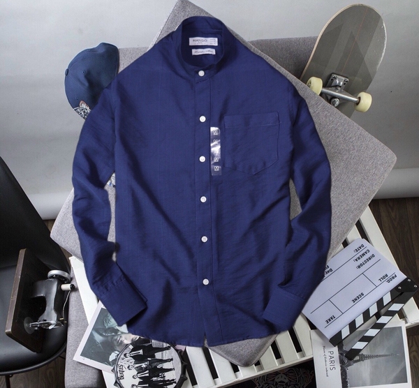 Áo Sơ Mi Trơn Cổ Trụ Dài Tay Màu Xanh Đen